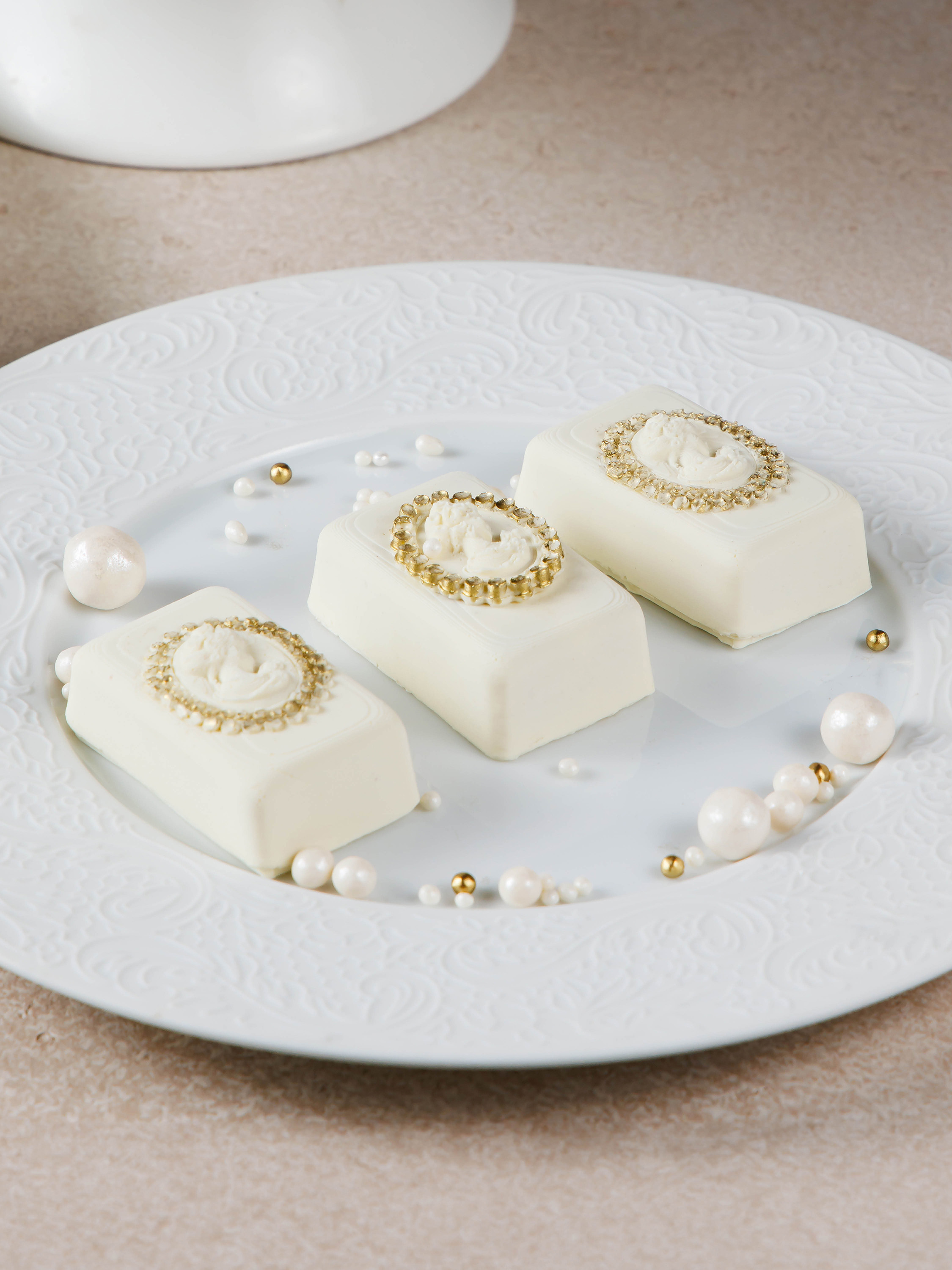 Нежный ганаш из розы на белом шоколаде, искристый мармеладный центр из шампанского, тонкий хруст. Корпус из белого шоколада.