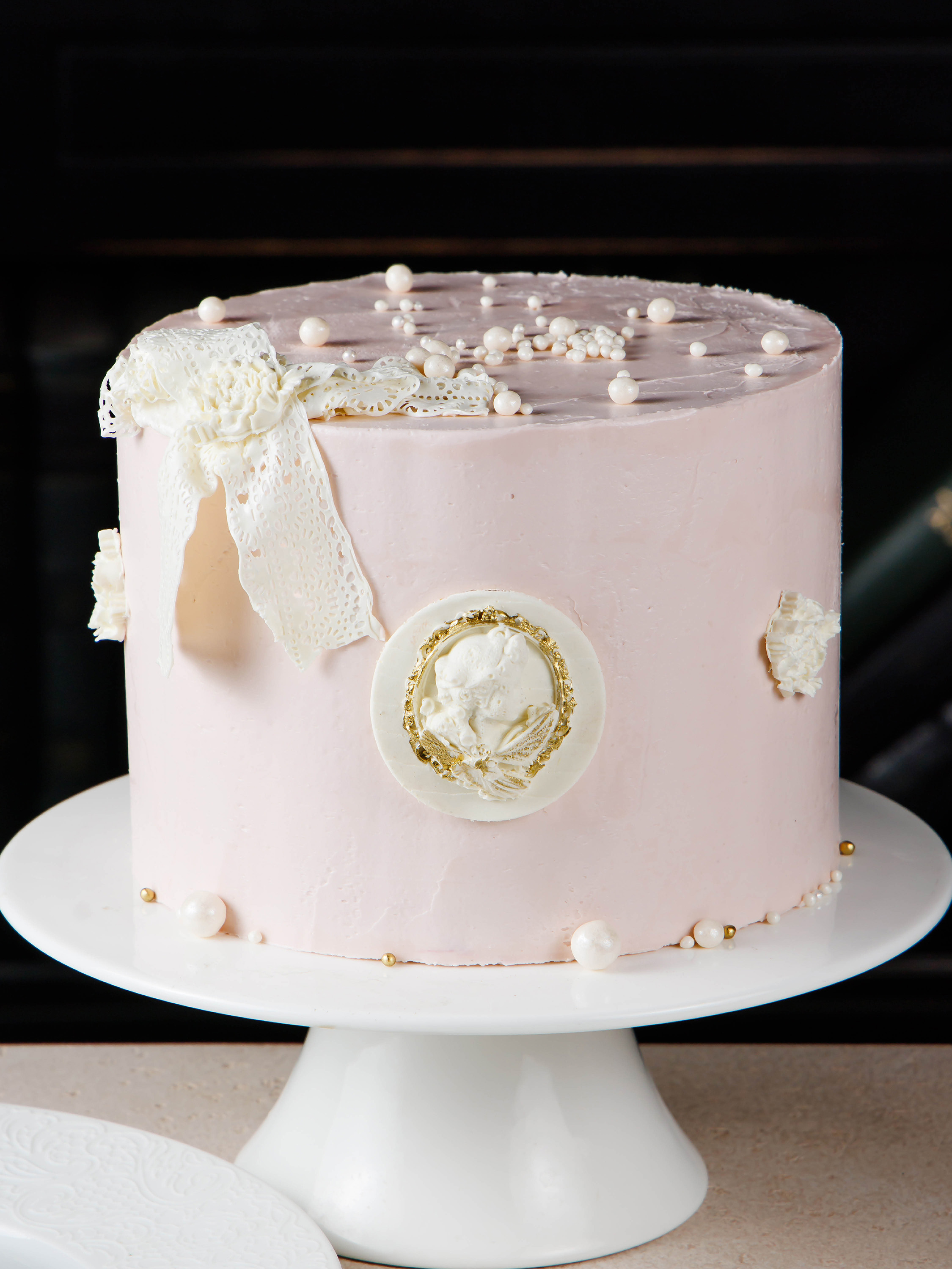 Ванильный бисквит на фермерском масле, кремчиз на сливках, клубничное компоте, мармелад из шампанского, крустилант, декор из белого шоколада и сладкого кружева.